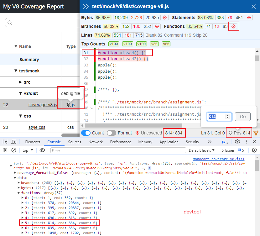 下,这样我们可以打开v8报告的html文件,通过下面新增的一些调试帮助信息来核对覆盖率